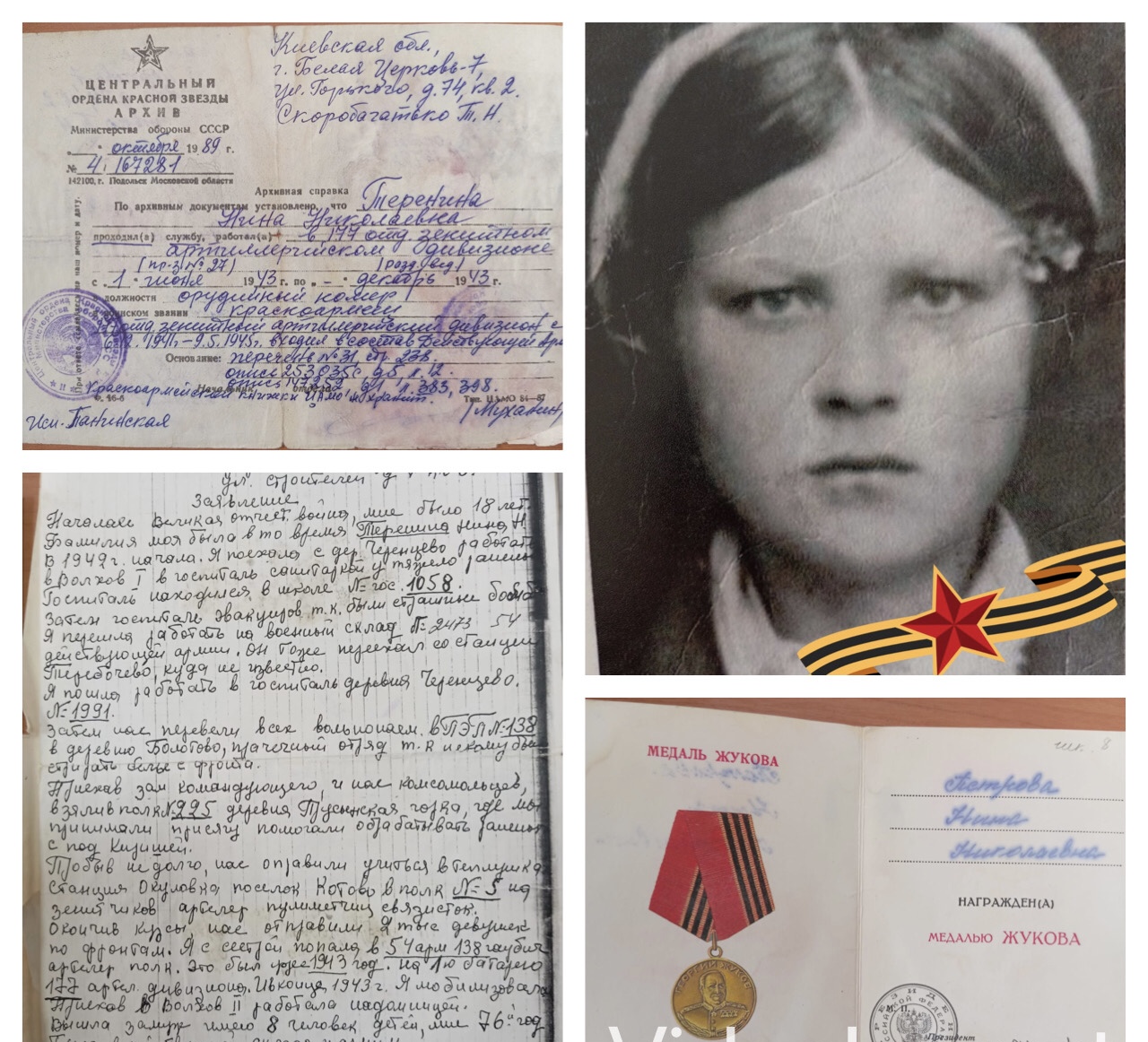 Петрова (Теренина) Нина Николаевна 01.10.1923 - 06.09.2001 На момент начала Великой Отечественной войны Нине Николаевне было 18 лет. В то время, проживая в деревне Черенцево Киришского района, она поехала в город Волхов Ленинградской области работать в госпиталь санитаркой, ухаживать за тяжело ранеными. Госпиталь находился в школе № 1058. Позже госпиталь эвакуировали, из-за сильных бомбардировок, и Нина Николаевна перешла работать на военный склад № 2473 на станции Теребочево 54-й действующей армии. Вернувшись позднее в госпиталь № 1991 в деревне Черенцево, всех вольнонаёмных перевели в эвакуационный пункт № 138 в деревне Болотово Волховского района Ленинградской области, в прачечный отряд. После приезда заместителя командующего, их как комсомольцев, определили в полк № 225 деревни Прусинская Горка, где они приняли присягу и продолжили помогать раненым, которых доставляли с Киришской земли. Спустя недолгое время Нину Николаевну и комсомольцев отправили учиться на станцию Окуловка в посёлок Котово Новгородской области, в полк № 5 на зенитчиков, артиллеристок, пулемётчиц, связисток. После окончания курсов 2000 девушек распределили по различным фронтам. Нина Николаевна с сестрой попала в 54-ю армию 138-го гаубичного артиллерийского полка. |